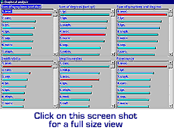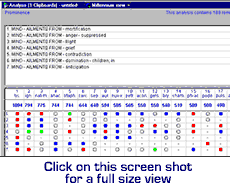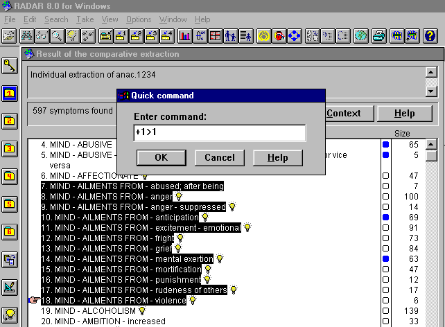 For the following study, I sorted this resulting list into chosen categories, using RADAR's analysis clipboards. Below, several symptoms of the Stimulus dimension are selected (highlighted by control-clicking on the rubrics), and are being entered as a group into clipboard #1. The "Quick Command" dialog box pops up automatically when one types any key - here, the "+" key - for adding a rubric to the clipboard. The first "1" indicates the underlining or weighting one wishes to give the rubric(s) being added. The ">1" command directs these rubrics to analysis clipboard #1: